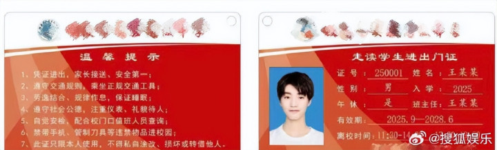 开学季将至,一波“实用型操作”突然刷屏——多所中学竟不约而同将王俊凯的蓝底证件照直接用作走读生出入证的官方模板!学号250001、姓名王某某、有效期2025.9-2028.6……字段清晰、条款齐全,就差没印上一句“本人郑重承诺:不带手机、乖乖被家长接送”。